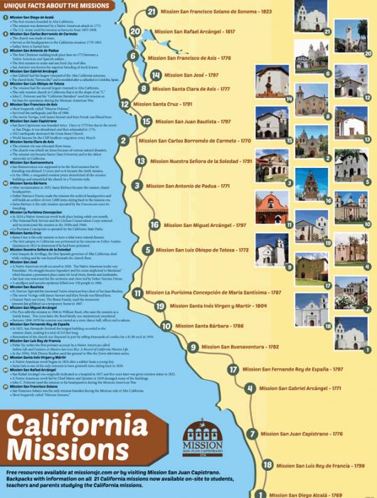 This colorful map's dimensions are 17" x 22" and also provides unique facts about each of the 21 California missions.
