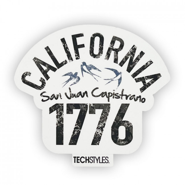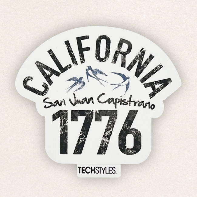 Adhesive sticker featuring California text, the famous San Juan Capistrano swallows and the founding year 1776.