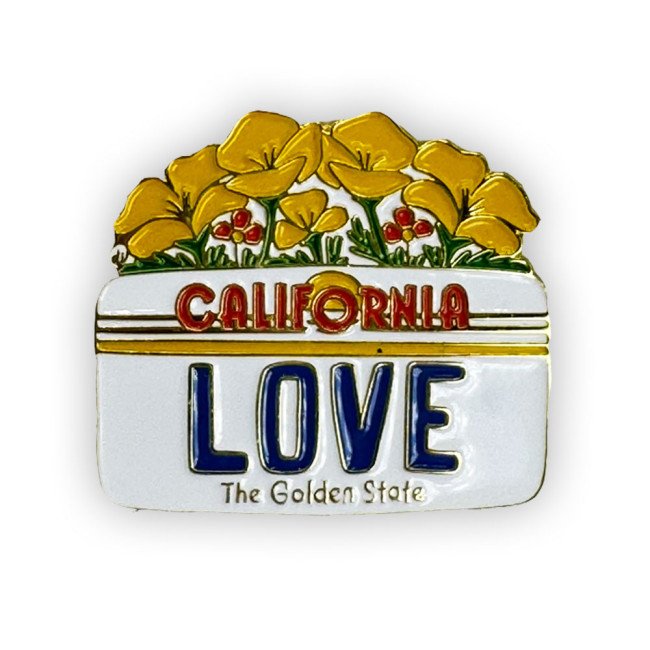Gold soft enamel pin featuring California love license plate and golden poppies.