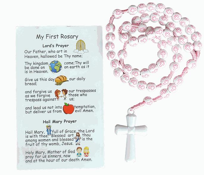 A pink cross rosary perfect for children, includes "My First Rosary" prayer card. Measures: 15" length.