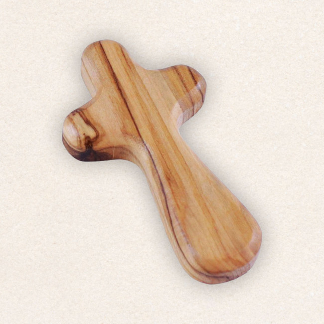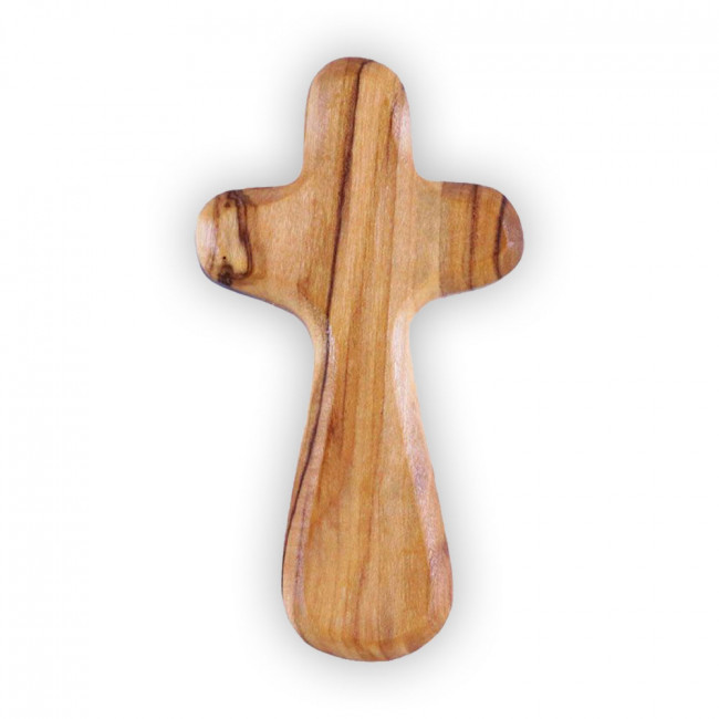 Light weight, hand carved from Olive wood cross made in Bethlehem. This cross provides comfort anywhere, in the home, in a hospital, at a doctor's visit, outdoors or during prayer.