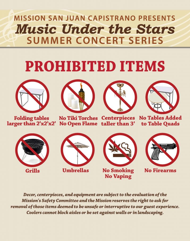 For the safety and comfort of our guests, please note the prohibited items. Decor, centerpieces, and equipment are subject to the evaluation of the Mission’s Safety Committee and the Mission reserves the right to ask for the removal of those items deemed to be unsafe or interruptive to our guest experience. Please note: Open flame is prohibited to preserve the safety and integrity of our historic site.