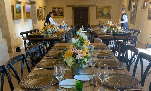 The historic Soldiers Barracks Gallery is an ideal space for exclusive daytime or evening events. This charming adobe building, with a private patio, is most suitable for smaller meetings, private dinners, lunches or special occasion brunches. This room can accommodate up to 75 guests for a sit down meal without any additional tables or equipment set-up in the interior. Luncheons or dinners with a buffet set up, room for a speakers’ podium or presentations, etc. should plan on accommodating closer to 60 guests at round tables.