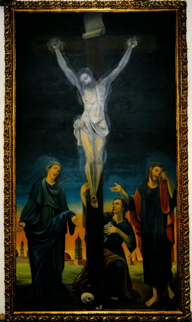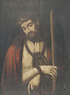 The original painting is part of the Station of the Cross collection of historic paintings that came from Mexico to Mission San Juan Capistrano in the early 1800s. Years of poor handling and environmental conditions led to its deterioration. In 1973, the then pastor of the Mission, Monsignor Vincent Lloyd Russell recognized the need for conservation but the Mission lacked the necessary funds for treatment. Monsignor Russell then directed parishioner and artist William Maldonado to paint a replica.