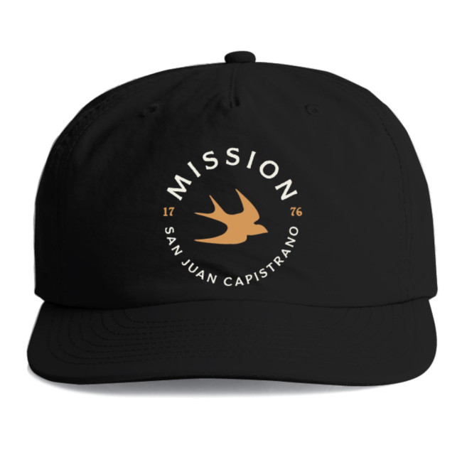 Black snapback cap with embroidered Mission San Juan Capistrano stamp design.