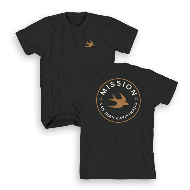 Adult unisex t-shirt in black featuring Mission San Juan Capistrano and swallow stamp design.