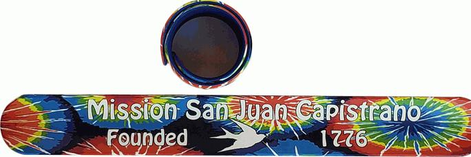 A branded Mission San Juan Capistrano tie-dye slap bracelet, a favorite!