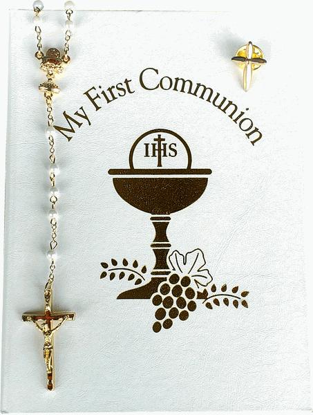 A First Communion set containing a Communion book, a rosary and a cross pin.