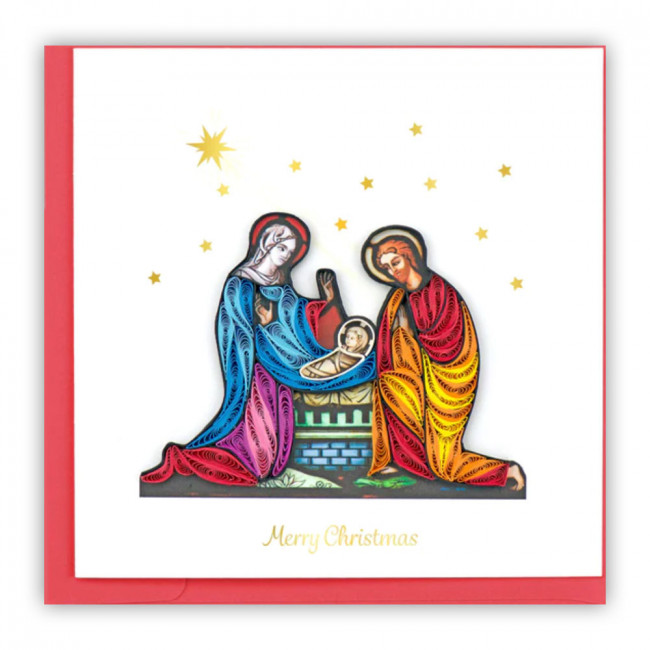 Handcrafted in Vietnam using the art of rolling, coiling and shaping small strips of paper featuring the nativity scene.