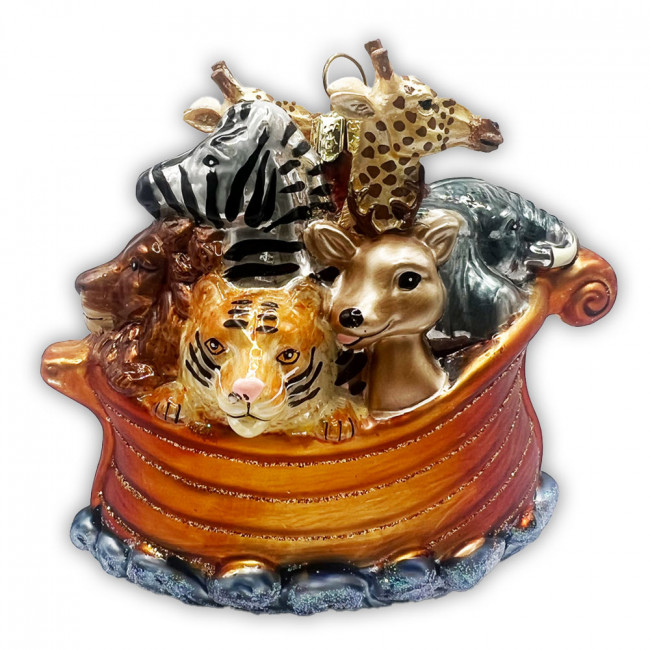 This Noble Gems glass Noah's Ark ornament from Kurt Adler is a traditional addition to your home or holiday décor. This beautifully detailed ornament features giraffes, a zebra, deer, hippo, lion, cheetah and elephant in the ark.