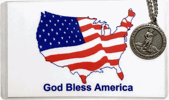 A set featuring a prayer card for Military Service and a St. Michael Protect Us medal.