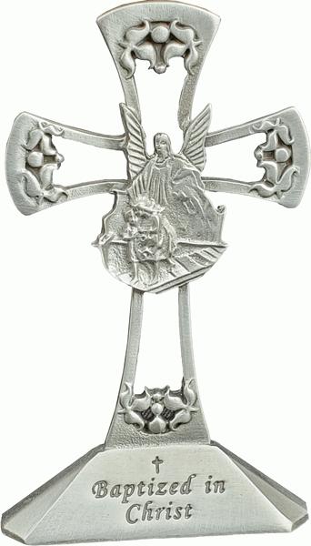 A 4" standing baptism pewter cross to display on tables, great gift for new parents.