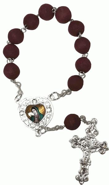 A rose petal rosary featuring Our Lady of Guadalupe.