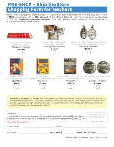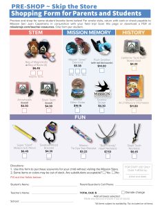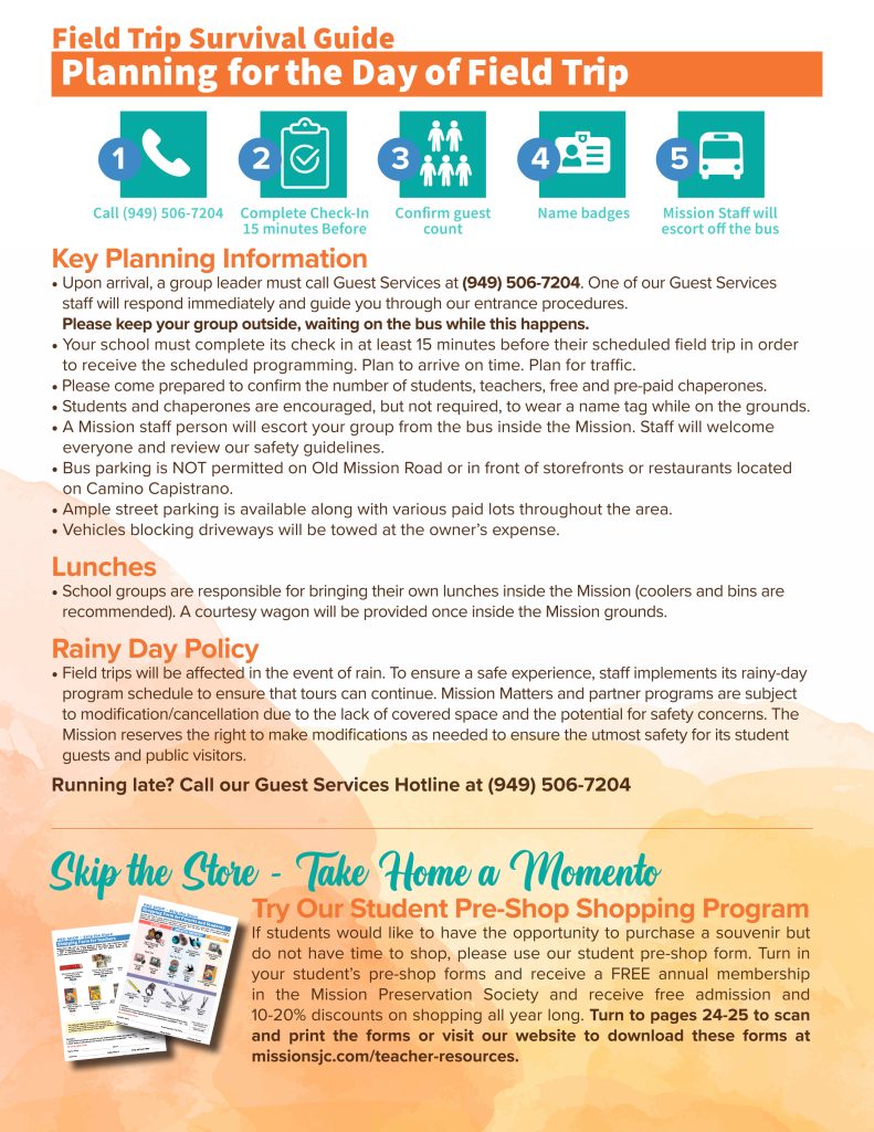 Return with cash or check payable to Mission San Juan Capistrano on Field Trip Day or before your schedule distance learning program and receive a FREE membership with a 15% discount at the Mission Store all year! Visit the Mission Store online at www.missionsjc.com/store to find more and to purchase directly.