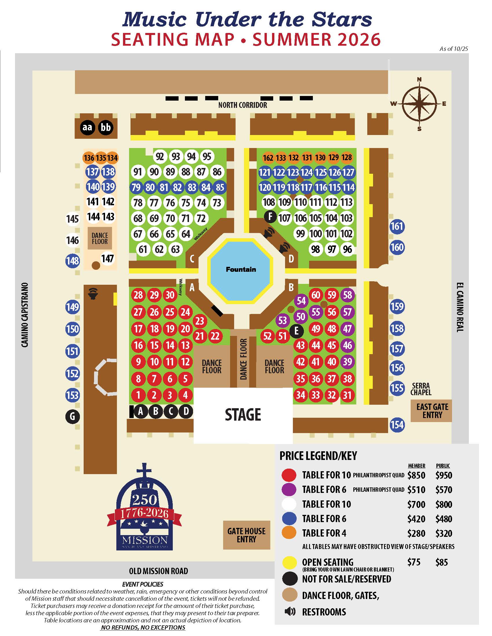 Should there be conditions related to weather, rain, emergency or other conditions beyond control of Mission staff that should necessitate cancellation of the event, tickets will not be refunded. Please consider the cost of your tickets a charitable donation in support of Mission San Juan Capistrano, historic California landmark #200 and 501 (c)(3) non-profit organization #95-1904079.