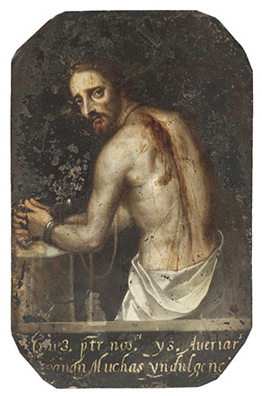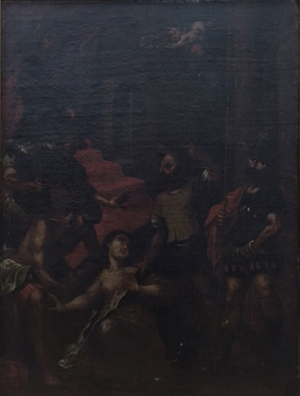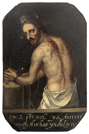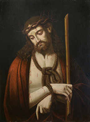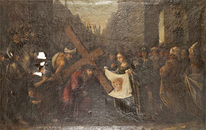 The original painting is part of the Station of the Cross collection of historic paintings that came from Mexico to Mission San Juan Capistrano in the early 1800s. Years of poor handling and environmental conditions led to its deterioration. In 1973, the then pastor of the Mission, Monsignor Vincent Lloyd Russell recognized the need for conservation but the Mission lacked the necessary funds for treatment. Monsignor Russell then directed parishioner and artist William Maldonado to paint a replica.