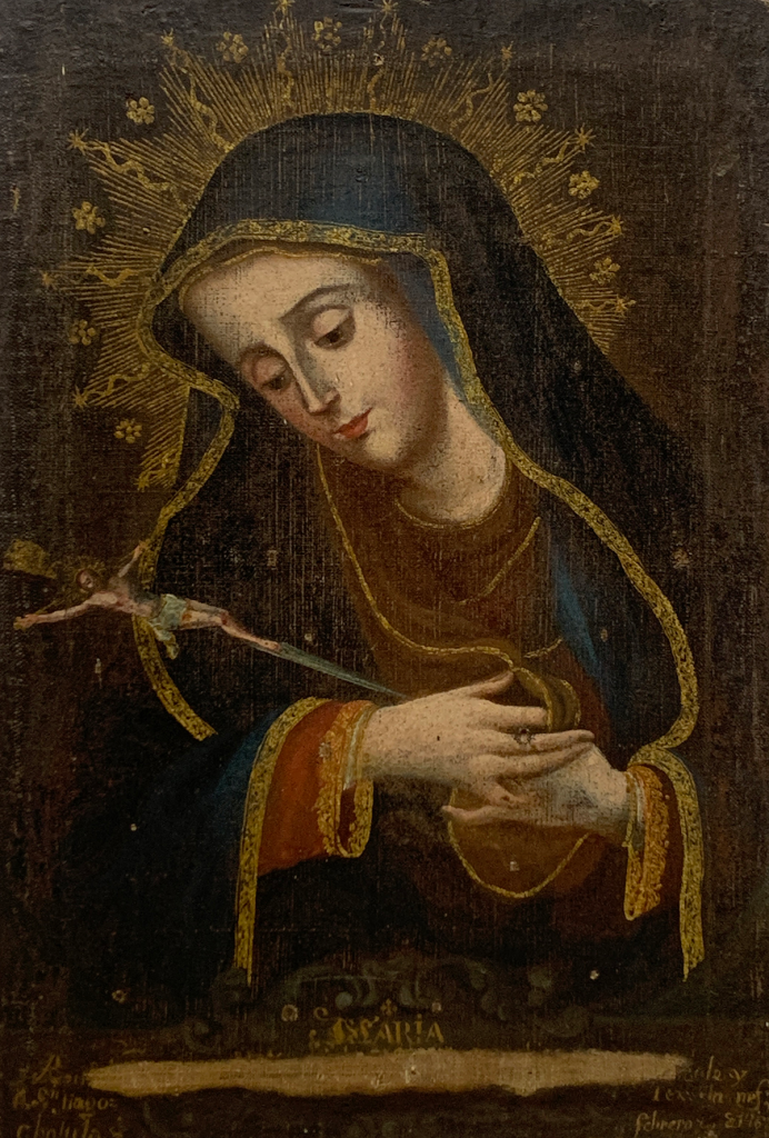 In late 2024 two paintings from the Museum’s collection were sent out for much needed conservation. Both works of art, “Our Lady of Guadalupe” (artist unknown), and “Our Lady of Sorrows” (artist unknown), date to the late 1700s, and were in need of cleaning and inpainting due to minor paint losses. Both paintings also have text at the bottom that was obscured due to discoloration, dirt, and paint loss. Our conservators at Fine Art Conservation Laboratory in Santa Barbara, California were contracted for this project. The two artworks are scheduled to be returned to the Mission this spring in better condition and ready to be enjoyed by the public.