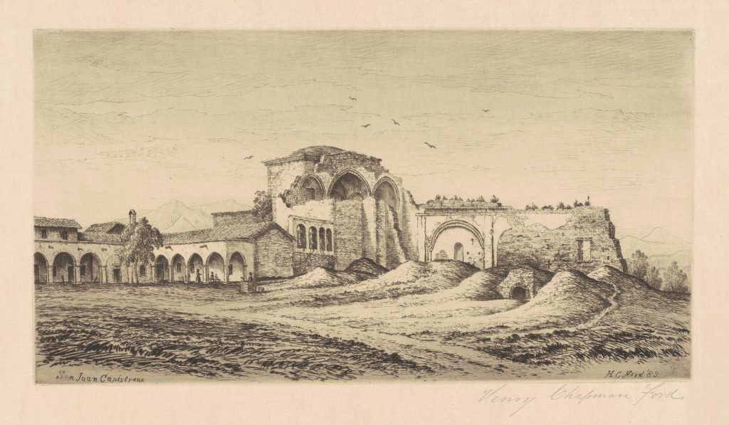 In the late 1800s, American artist Henry Chapman Ford traveled through California by horse and buggy, visiting each of the missions to create paintings, drawings, and etchings of the historic landmarks. His work is often credited with reviving public interest in California’s Spanish era and preserving an important visual record of the missions before the turn of the century.