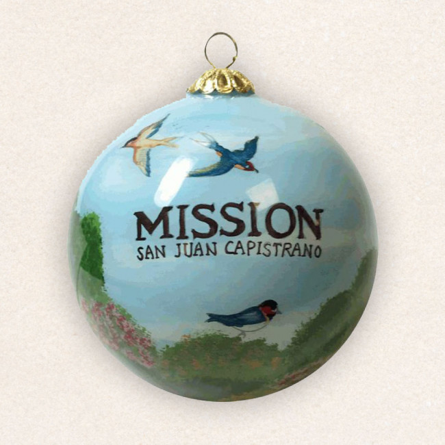 A hand painted collectible glass ornament commemorating Mission San Juan Capistrano and the Return of the Swallows celebration on March 19.