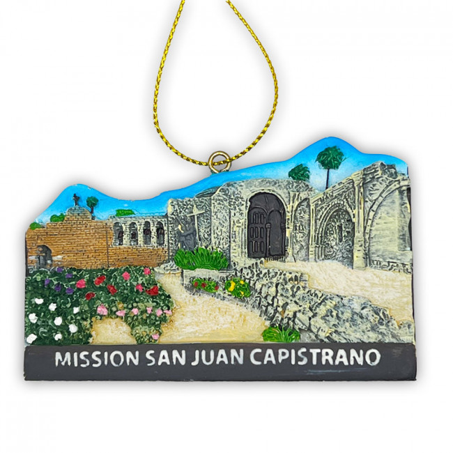A molded Mission San Juan Capistrano ornament featuring a panoramic view of the Great Stone Church, Bell Wall and Front Courtyard gardens.
