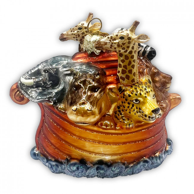 This Noble Gems glass Noah's Ark ornament from Kurt Adler is a traditional addition to your home or holiday décor. This beautifully detailed ornament features giraffes, a zebra, deer, hippo, lion, cheetah and elephant in the ark.