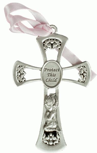 A pewter silver 10" cross with a light pink ribbon, a gift for newborns or baptisms.