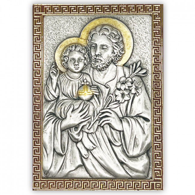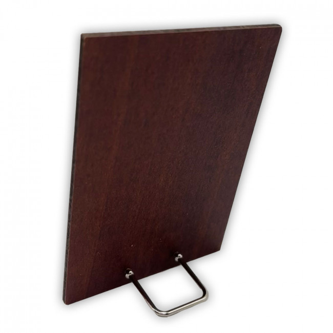 Decorative silver-tone plaque with gold-tone accents on wood backing. Reverse side has a stand for ease of displaying.