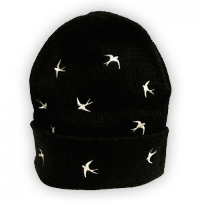Comfortable black beanie with white swallow pattern.